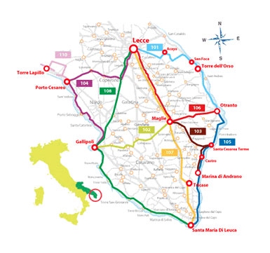 STP‘s services are also active, namely the Public Transportation Company of Terra d’Otranto.